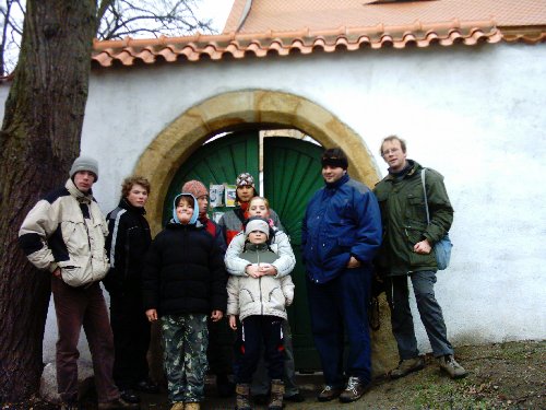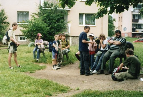 Milovickém sídlišti. Na obrázku vidíte většinu účastníků výletu. Zleva: Myšinka, Anežka, Jirka, Martin, Robert, Alakudózino koleno, Mouka, Lucka, Eliška, Hroch a Martin. Bizon fotí. |