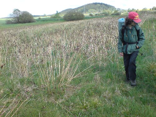 Celý výlet vedl mimo turistické značky, na obrázku je Anežka s uschlými loňskými kosatci na PP Prachomety. |