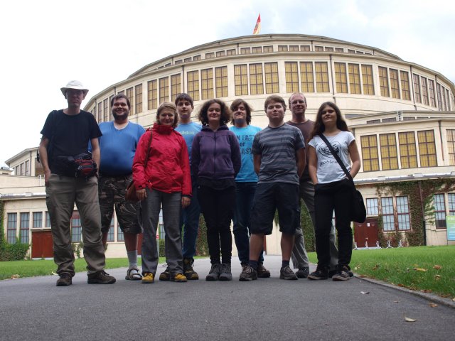 vytáhl na tři dny do Wroclvi a na horu Sleza. Zleva: Myšinka, Hroch, Kapybara, Prtě, Anežka, Robert, Ariel, Bizon, Žába V pozadí památka UNESCO Hala Stulecia. |