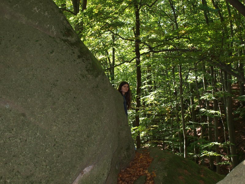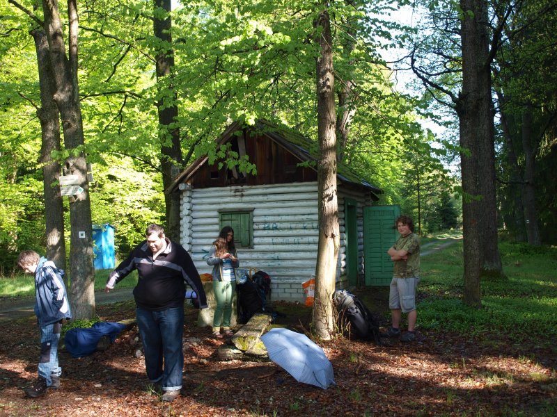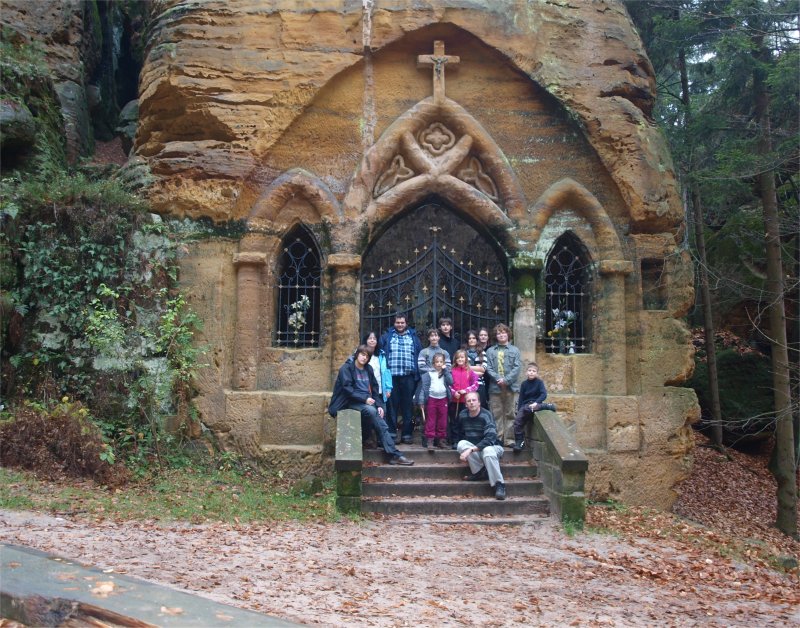 Na celodenním výletě jsme pak procházeli skalami v okolí Sloupu, zde před kaplí v Modlivém dole. |
