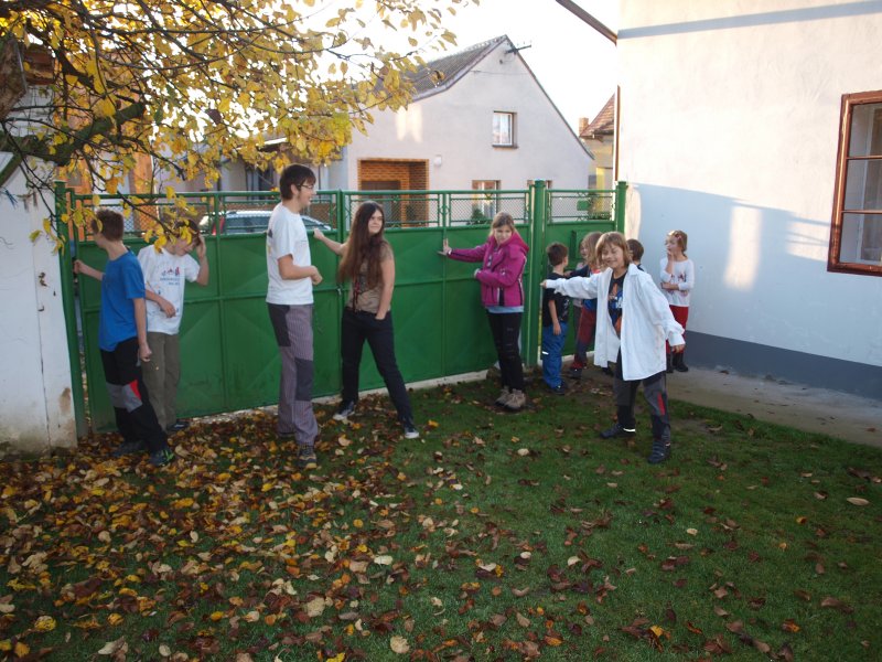 Čekala nás řada her venku i v chalupě. Zde Hanka vysvětluje hru na přivádění žáků ke zkouškám. |