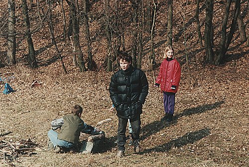 Jedním z úkolů bylo i rozdělávání ohně, zde se Dan snaží a Ucho s Beruškou přihlížejí. |