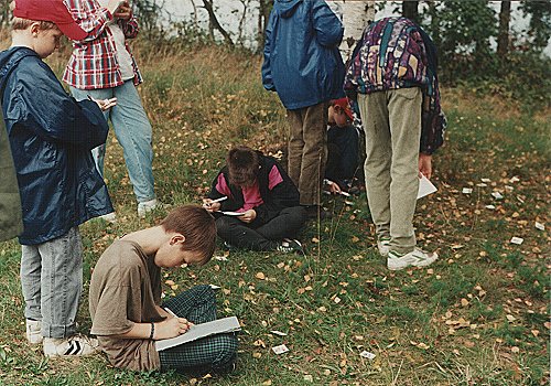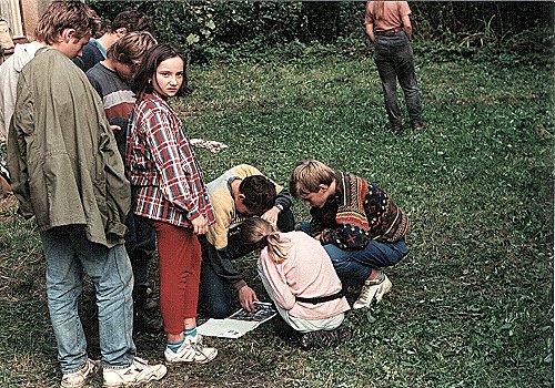 | 7. října 1995 jsme pod vedením Brodiče navštívili knihu Cesta do středu Země. Na fotografii se děti snaží určit co nejvíce hub. | |