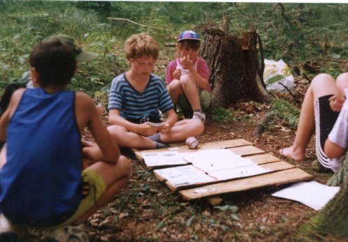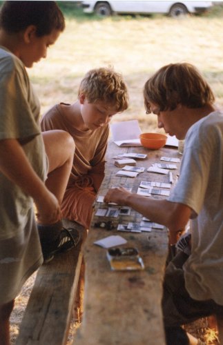 Pohled na hráče deskovo-karetní části terénní a deskovo-karetní hry na letošním táboře. Martin právě přemýšlí, kterou z karet by použil. |