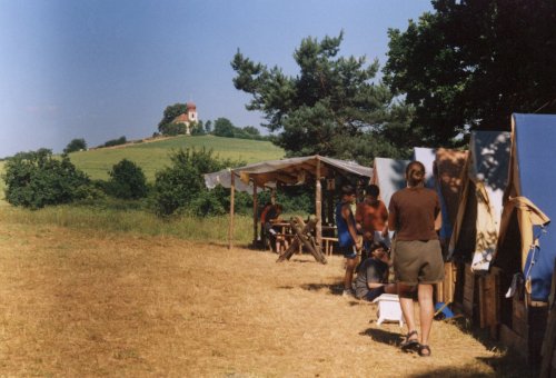 Pohled na táborovou kuchyni s Bukovským kostelem v pozadí |
