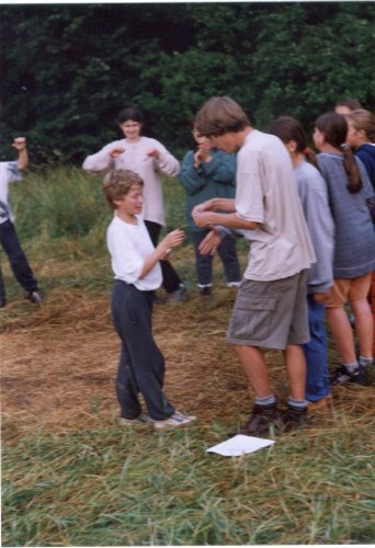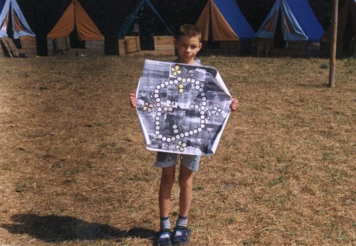 Vítěz první části Tomáš s plánem celotáborové hry pro první část. Bohužel jej drží vzůru nohama. |