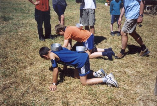 Jednou z překážek celotáborové hry pro první část tábora bylo i překonání bažiny plížením, vlhkost bažiny symbolizovaly ešusy s vodou, které se dříve či později na záda každému vylily. |