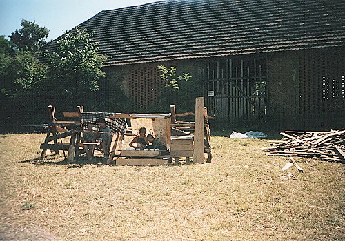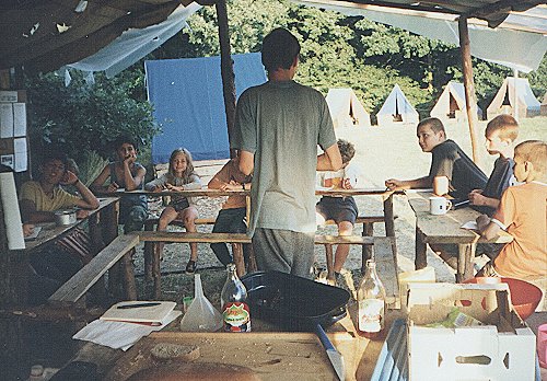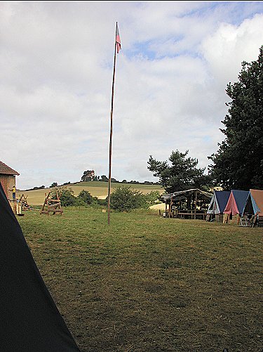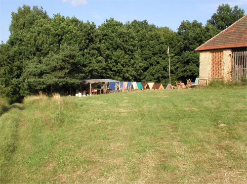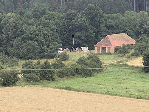 Tento pohled už je z roviny tábořiště. Vidíme kuchyň i stany mizející za mírným návrším na kterém stojí stodola. |