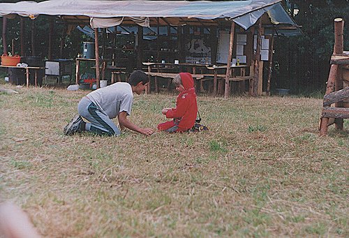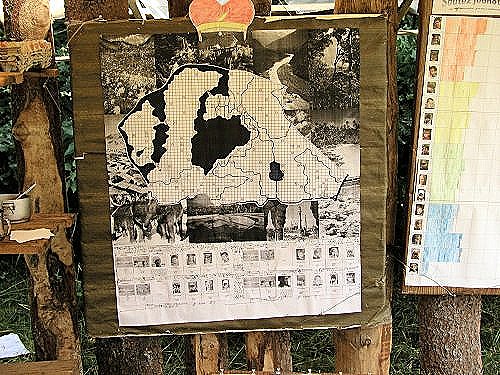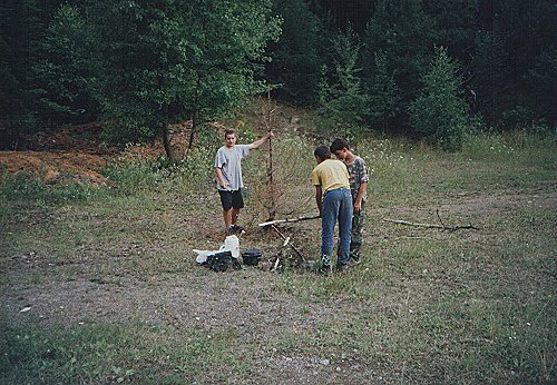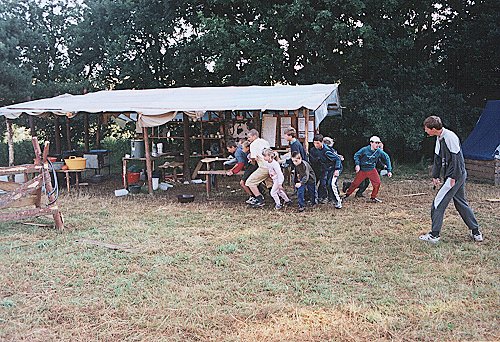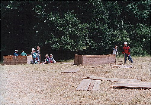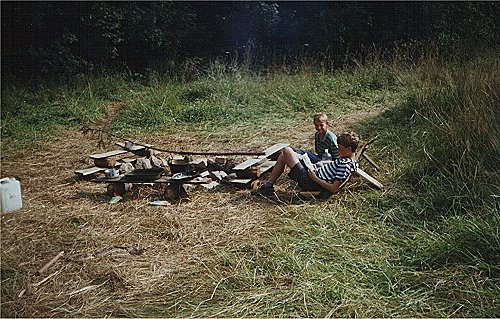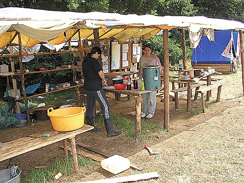 Tábor začíná vždy stavbou. Zde je pohled na započaté konstrukce stanů ve východním cípu louky. |