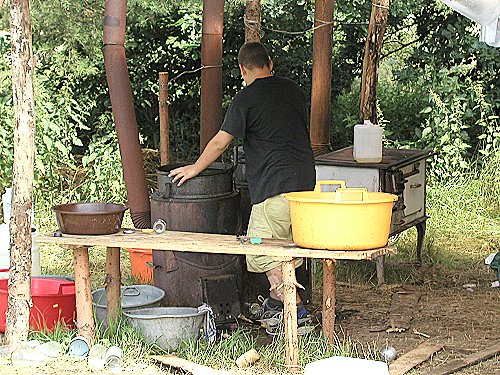 Pohled na táborovou kuchyň, kde Mirek právě myje jeden z pařáků. |