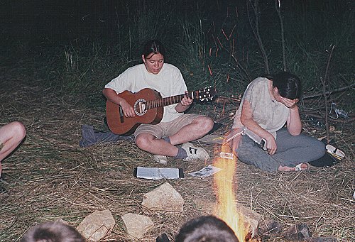 Hraní písní u slavnostního ohně. Statkářka nehodnotí Nikitinu hru, jen skrývá tvář před objektivem reportéra. |