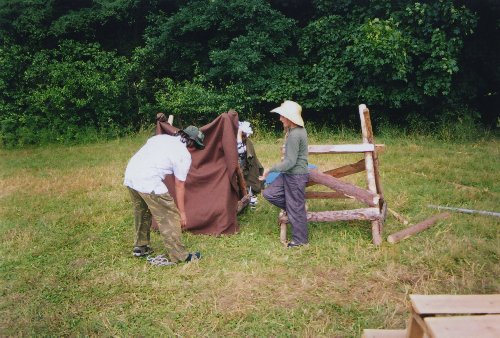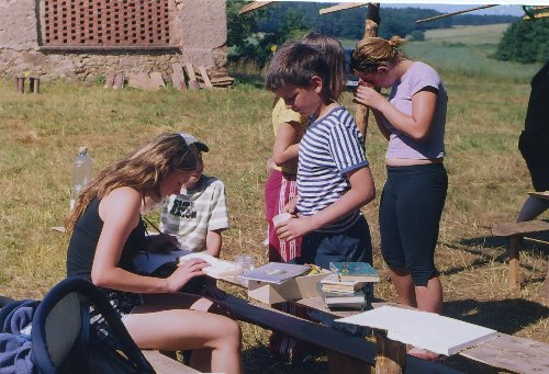 Tábor byl postaven v běžném tempu a začaly programy, letos mám fotografie nějak nerovnoměrně rozložné, takže hned na úvod můžeme nahlédnout na tématický program poznávání hmyzu. Jirka, Prtě a Gábina studují hmyz v atlase, v pozadí Alakudóza a Vitamín prohlíží chycené exponáty. |
