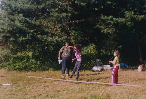 Na počátku tábora s námi Myšinka neby, jen co se vrátil, uspořádal tradiční zápolení OkOspOrt. Na fotce je závod ve vrhu oštěpem a háže za Hrochova a Vitamínina dohledu Anežka. |