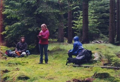 A tohle už opravdu jsou ma...teřská škola. Letos bylo, jak to tak chodí, poněkud vlhko. Tady je pohled na členy skupiny 3, kteří se snaží najít co nejvíc věcí na S, které s sebou mají. |